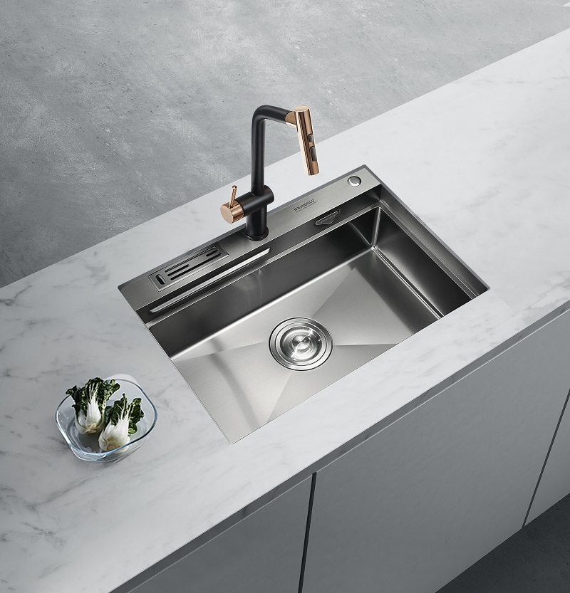 NN系列水槽組合套裝槽體采用環保黑鈦納米工藝覆上薄膜,水滴在薄膜上立成球體,自由滾動帶走污跡。油污醬汁一沖即凈,水過無痕,輕松自潔。