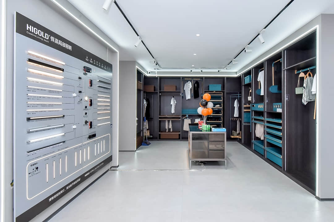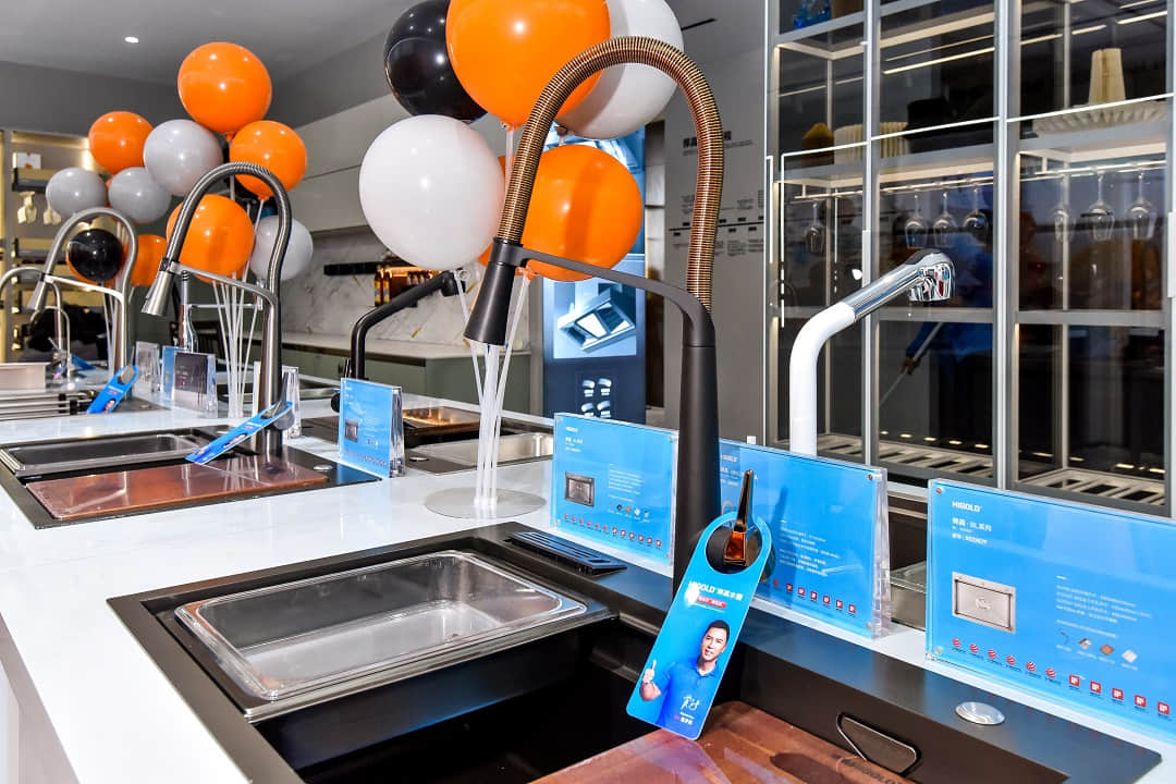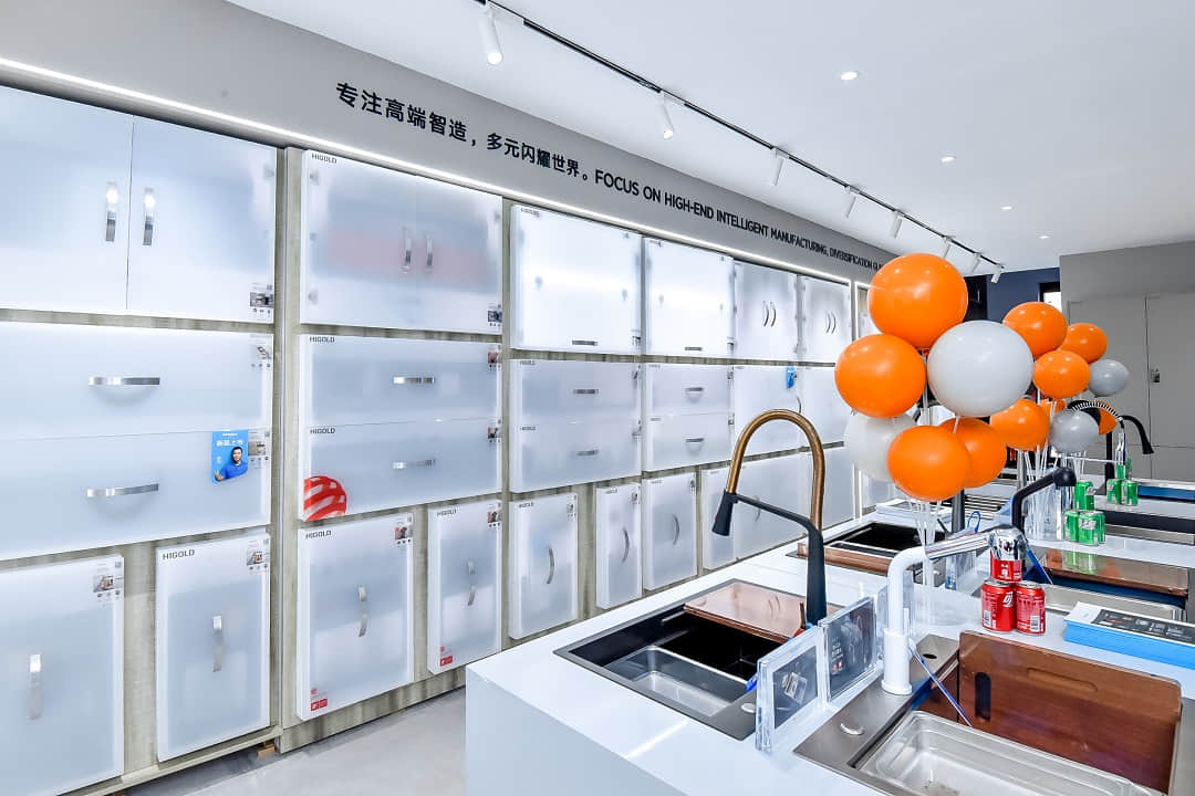 悍高哈爾濱旗艦店展廳空間規劃為廚房功能五金、衣柜功能五金、基礎五金、水槽龍頭、裝飾五金、智能廚電、衛浴五金區域,消費者到店即可體驗一站式的全屋五金解決方案。