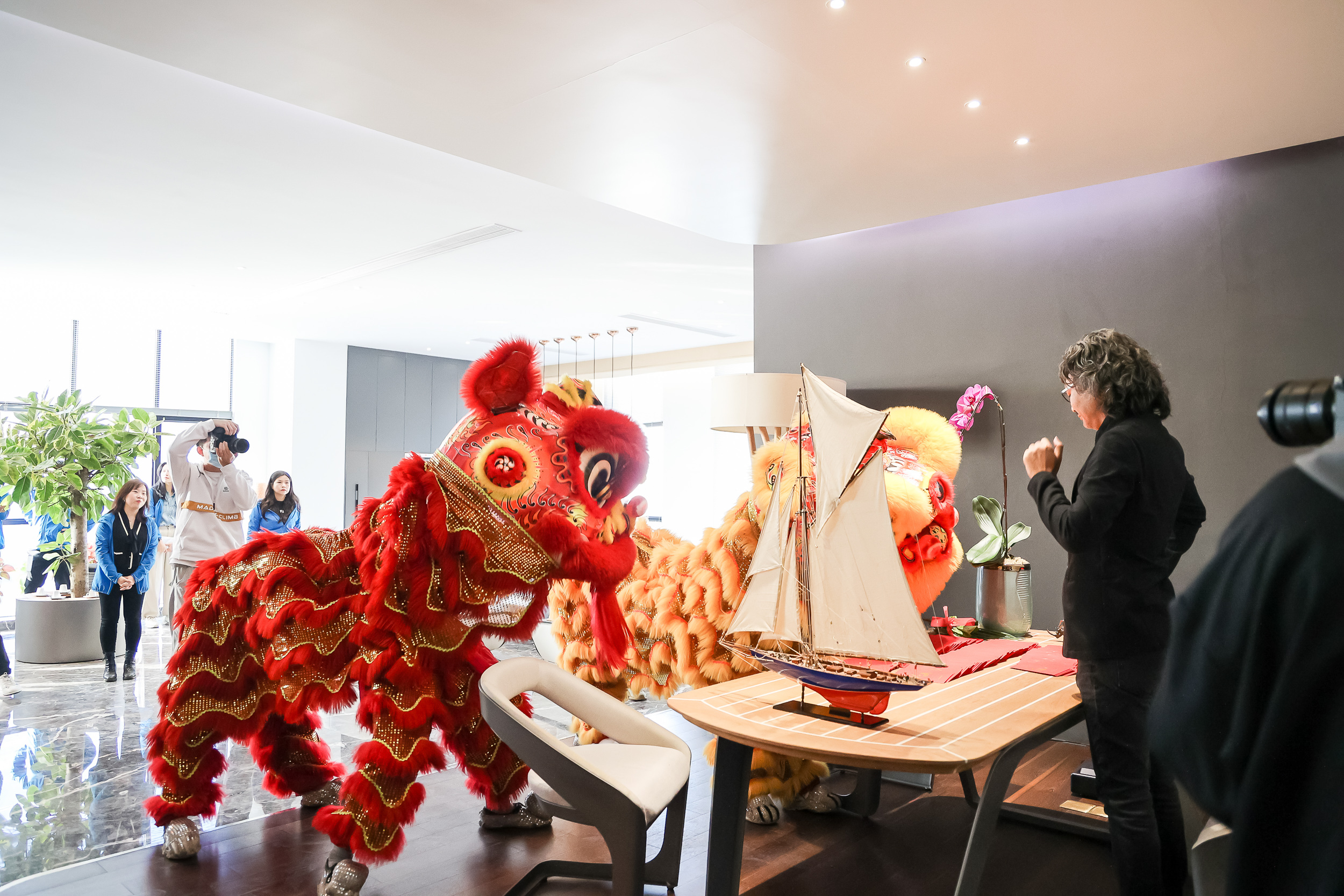 “金鼓一響黃金萬兩、金獅點睛富貴繁榮”。吉時到,鞭炮鳴、鑼鼓響,雄獅聞聲昂頭,龍騰生風、翻騰跳躍,進行采青、獻瑞,向悍高高層和一眾員工獻上吉祥如意,象征悍高新的一年生財利市、財運亨通、興旺發(fā)達。
