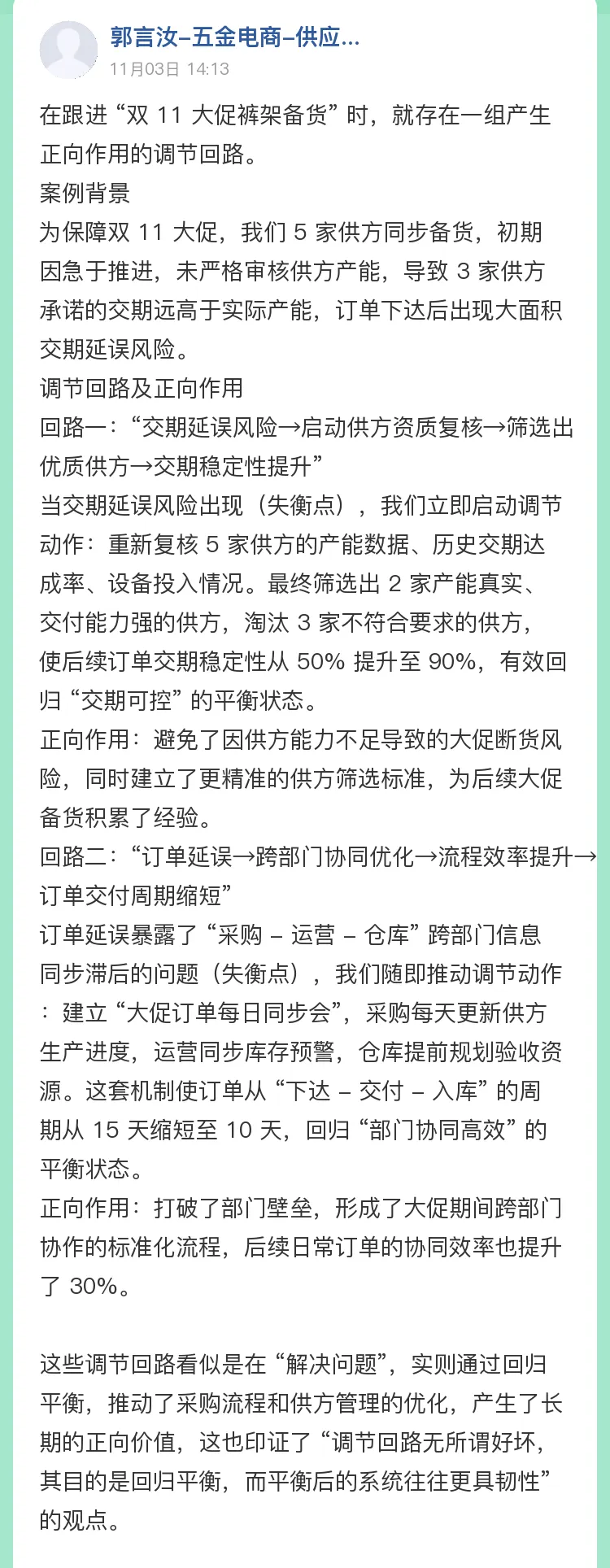 經過8日線上深度學習,同學們系統構建了系統思考的知識體系:從系統的基本構成(要素與連接關系),到動態分析的起點(變量與因果鏈),再到系統的核心驅動力與穩定機制(增強回路與調節回路),乃至時間延滯帶來的復雜影響——通過每日遞進的知識點解析與案例拆解,大家逐步內化了系統思維的核心概念。這段聚沙成塔的歷程,不僅幫助同學們夯實了理論基礎,更在潛移默化中培養了系統思考的微習慣,為后續的進階學習與實戰應用鋪就了堅實的思維基石。